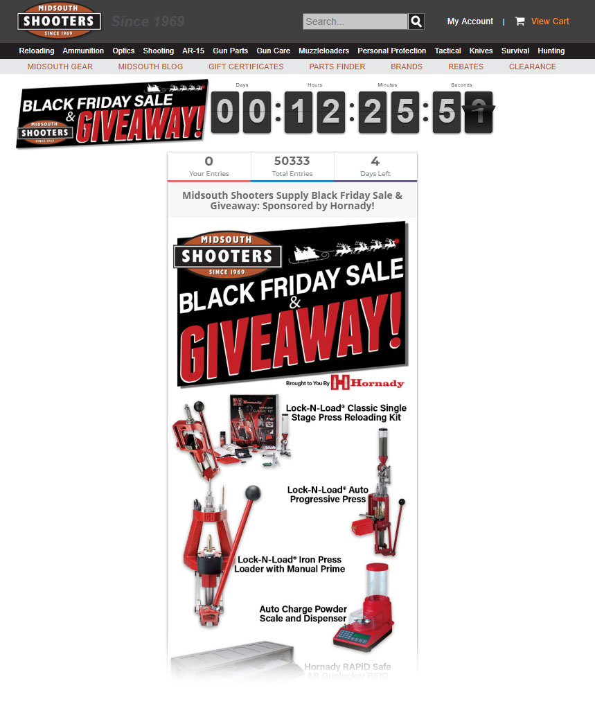Coupon Code « Daily Bulletin Coupon Code: VST — $40 Off $450 or more Expiration date: Unknown. Coupon Code: VSJ — $20 Off $250 or more Expiration date: Unknown ... Midsouth Shooters Supply now has the BoreCam for $222.46. Grab it while you can at that price. Other online vendors are charging a LOT more. For example, the MidwayUSA price is $259.99. 3. RCBS — Buy Green ...