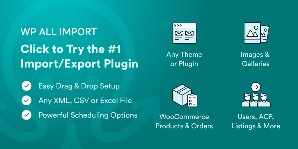 Advanced XML & CSV Imports - WP All Import In-Depth Overview Coupons. Reviews. Google Merchant Center. ACF. Overview. Text Fields. Picker Fields. Media Fields. ... Code Snippets. Action Reference. WP-CLI. Add-On API. Overview. Add-On Structure. Text Fields. ... Import CSV and XML files to WordPress, or export from WordPress to Excel and other formats. Founded in 2011, we are the trusted solution for over ...