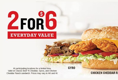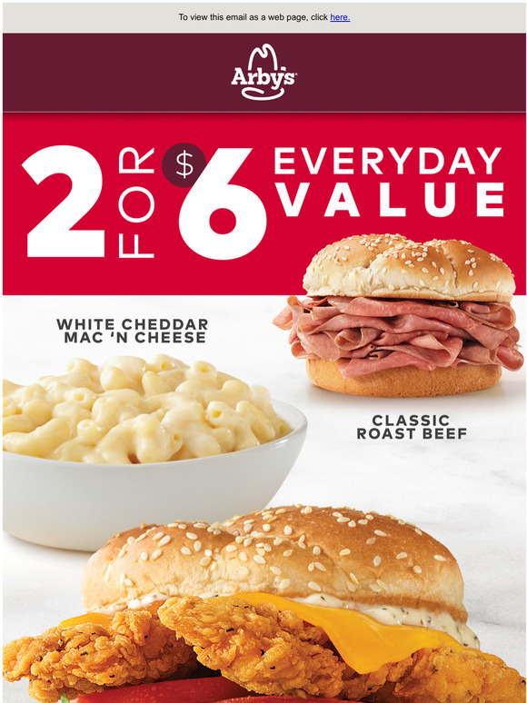 ARBY'S 2 FOR $6 MENU - DEALS | OPTIONS | NUTRITIONS - ArbysMenu Arby's 2 for $6 has these 3 choices: Chicken Cheddar Ranch Classic Roast Beef White Cheddar Mac n Cheese What is on the arby's 2 for 5 menu Arby's discontinued their 2 for $5 menu and now the 2 for $6 is live you can see the available items for you to enjoy the day. Related ARBY'S ALLERGEN MENU WITH NUTRITION January 2, 2022 In "Arby's allergen"